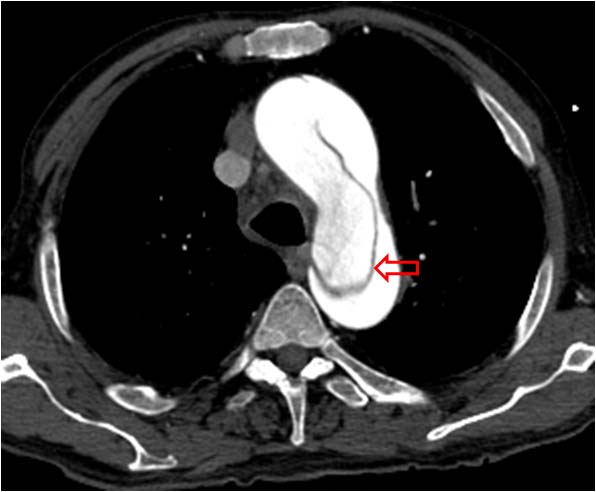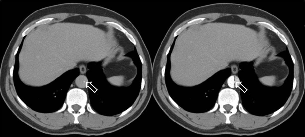 Signo de disección aórtica en la TC. Consiste en la presencia de una placa de calcio desgajada de la pared aórtica, acompañando al colgajo intimal. El signo se ha descrito en la placa simple (hay un ejemplo magnífico en http://www.wikiradiography.net/page/Calcium+Sign) y en la TC. En la imagen de la izquierda vemos la TC sin contraste mostrando el calcio intimal desplazado (flecha). El angioTC permite ver el flap intimal -con el calcio (flecha)- y la doble luz aórtica.