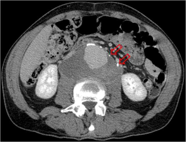Se trata, pues, de otro signo de rotura contenida o inminente. La imagen es del mismo paciente del signo anterior, ésta en fase portal. Obsérverse como los calcios intimales (flechas) están desplazados.