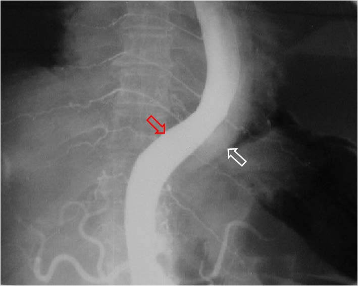 Imagen de aortografía en un paciente con disección. La luz verdadera está marcada con la flecha roja y la falsa con la blanca. Puede verse un ejemplo del signo en la resonancia en el Signo del colgajo (o flap) intimal.