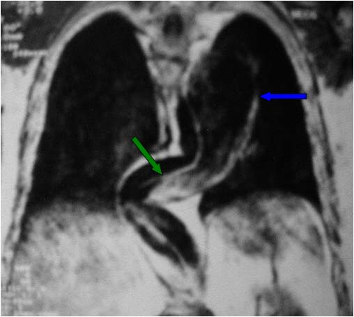 Corte coronal de resonancia magnética de tórax que muestra un aneurisma de la aorta torácica (flecha azul) con disección de la íntima (flecha verde).