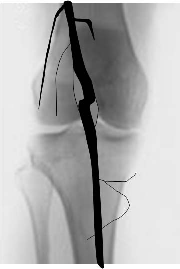 Signo de aneurisma de la arteria poplítea, parcialmente trombosado, que puede verse en la arteriografía y en reconstrucciones coronales de angioTC. Consiste en una aguda angulación del recorrido de la arteria poplítea, con o sin dilatación de la luz vascular, tal como muestra el esquema.