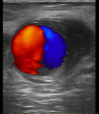 El pseudoaneurisma es una lesión de la pared vascular en la que se produce una fuga de sangre a un espacio contenido por la adventicia del vaso y/o una fascia circundante. La sangre entra y sale de dicho espacio por un mismo orificio, el cuello, lo que justifica el flujo en remolino. En doppler, el color azul o rojo indica la dirección del flujo, que se acerca o aleja del transductor.