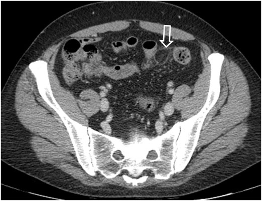 En la ecografía puede verse un anillo ovalado hipoecoico, coincidente con el punto de dolor. En TC se caracteriza por una densidad grasa ovoidea rodeada de un fino anillo denso (flecha) y de aumento de la densidad de la grasa adyacente. Puede verse también un punto central hiperdenso correspondiente al pedículo vascular trombosado.