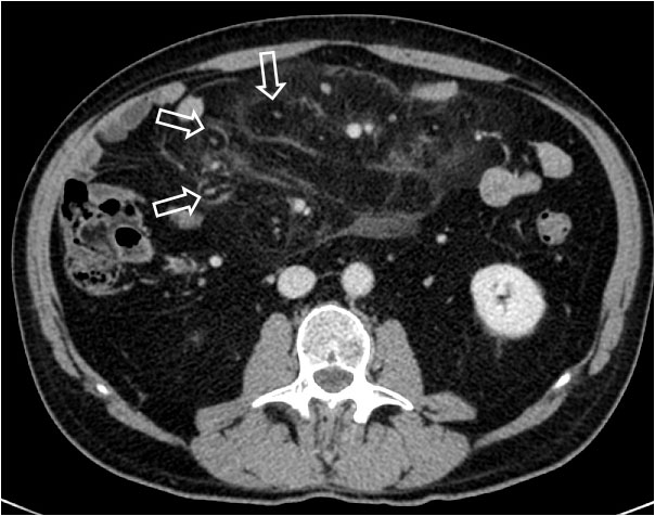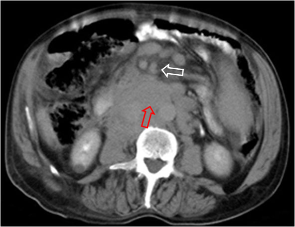 La fotografía corresponde a un paciente con linfoma (flecha roja) que forma conglomerados adenopáticos que respetan los vasos mesentéricos (flecha blanca).
