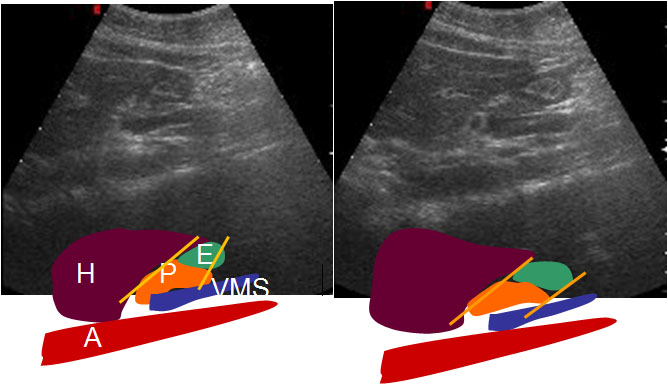 La presencia de este signo excluye invasión pancreática en pacientes con carcinoma gástrico. Los esquemas ilustran el desplazamiento normal. H: hígado. E: estómago.  P: páncreas.  VMS: vena mesentérica superior. A: aorta.