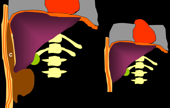 Desplazamiento medial del borde lateral del hígado en la radiografía simple de abdomen por colección intraperitoneal (aunque también se ha descrito en colecciones extraperitoneales).hellmerEsquema que muestra el hígado y algunas estructuras de vecindad. A la izquierda puede verse una colección (C) que se introduce entre el peritoneo y el borde lateral del hígado, al que desplaza medialmente. A la derecha, el esquema anatómico sin colección muestra el borde hepático no desplazado, delimitado por la grasa del flanco.
