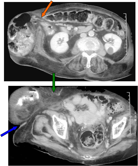 El ejemplo que mostramos corresponde a una hernia, de la que sólo es visible el margen inferior (flechas).pared incompleta2TC de abdomen con contraste oral e iv. del mismo paciente. La imagen superior muestra la herniación de asas intestinales (flecha naranja). La imagen inferior, correspondiente a un corte de pelvis, justifica el signo: un extremo del saco herniario forma un ángulo agudo con la pared abdominal (flecha azul) y es el borde visible en la radiografía; el otro extremo se continúa con la pared abdominal (flecha verde), lo que justifica la zona incompleta de la pared de la masa.