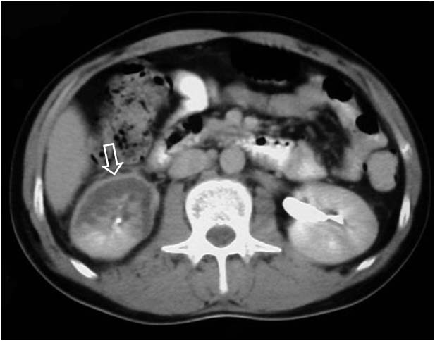 La imagen corresponde a una TC que muestra este signo (flecha) en el riñón derecho en un paciente con traumatismo renal con lesión del pedículo. La parte posterior del riñón no está afectada y conserva su vascularización.