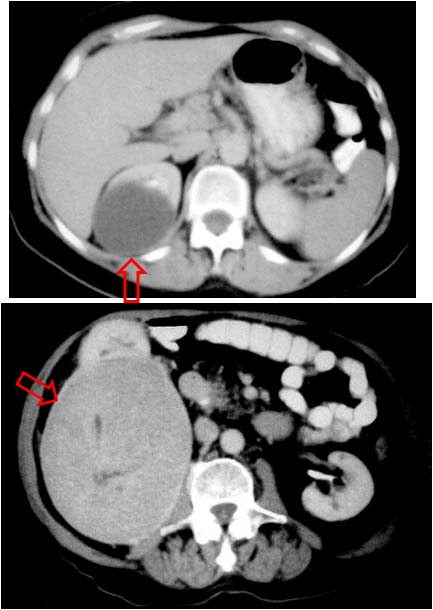 En la TC el signo es visible tanto en lesiones benignas (como el quiste simple de la imagen de arriba) como en malignas (carcinoma renal, abajo). Su interés consiste en confirmar el origen renal de las lesiones, no siempre fácil de determinar en las de gran tamaño y crecimiento extrarrenal.