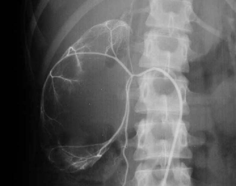 Aunque en el caso presentado, el estudio no es una urografía sino una arteriografía, el signo es similar. Vemos una delgada capa de parénquima (flecha) que rodea a los cálices dilatados, en esta fase aún no opacificados.