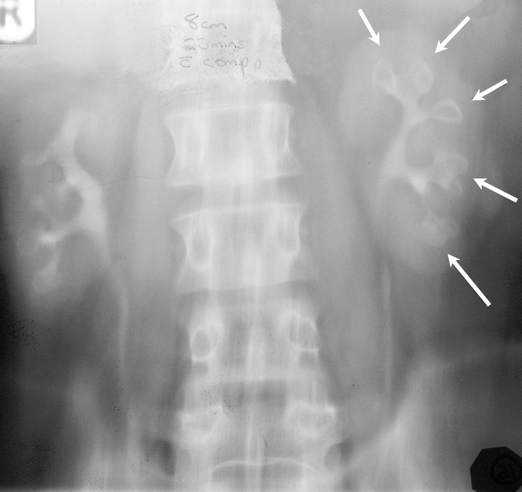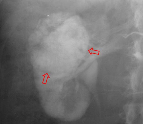 Signo de obstrucción renal crónica en la urografía intravenosa. Se ve mejor en la fase nefrográfica y puede desaparecer en la fase excretora. Se trata de unas bandas radiodensas por fuera del contorno calicial (flechas) que corresponde a la opacificación con contraste de los túbulos intramedulares distorsionados a causa de dilatación pielocalicial por la obstrucción crónica. Para que este signo pueda estar presente se necesita que el riñón conserve cierto grado de función excretora, y este dato es importante, puesto que la función renal es aún recuperable.