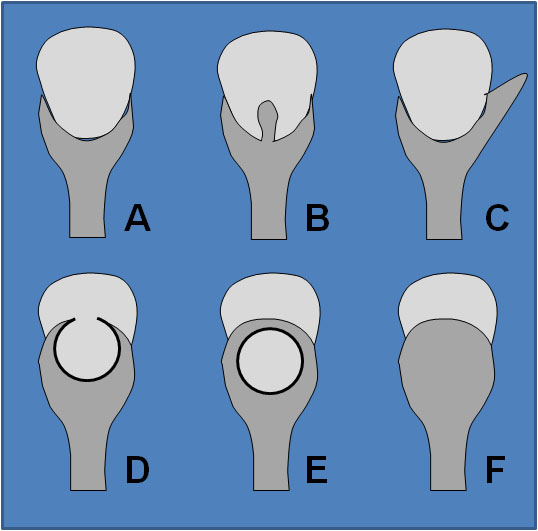Esquema que muestra diferentes patrones de excavación de la necrosis papilar. A) normal. B) Excavación central cuyo aspecto se ha descrito como Signo de la pelota de golf en el tee (el tee es la pieza cuya forma es parecida a un clavo y en la que se apoya la pelota de golf para golpearla). C) Excavación del fórnix. D) Excavación con aspecto de pinzas de cangrejo o de langosta. E) Signo del anillo a anillo de sello. F) Papila desprendida con cáliz abombado.