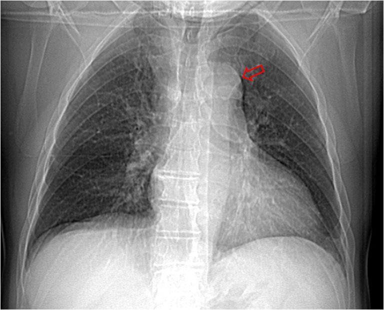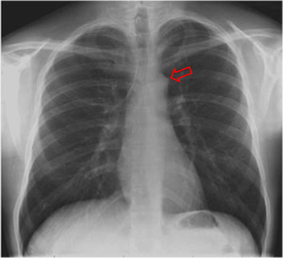El pezón aórtico consiste en un pequeño abultamiento visible en el cortorno lateral del botón aórtico (flecha), visible en hasta un 10 % de pacientes. La imagen corresponde a la vena intercostal izquierda prominente. esta vena recoge la sangre de los primeros espacios intercostales y drena en la vena braquiocefálica izquierda. Puede estar dilatada en las radiografías es espiración o en decúbito, pero también puede ser un signo de obstrucción de la vena cava superior, obstrucción o ausencia de la vena cava inferior, insuficiencia cardiaca congestiva, agenesia de la hemiácigos, hipertensión portal o, más raramente, drenaje venoso pulmonar anómalo total o parcial.