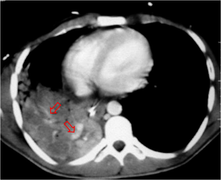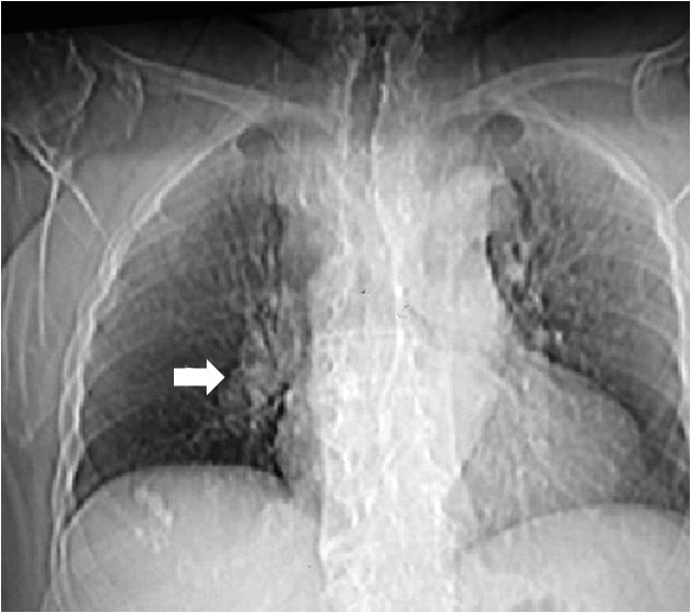 La fotografía corresponde a un paciente con contusión pulmonar en la base derecha donde aparecen varios vasos contrastados (flechas).