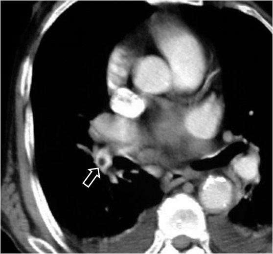 Signo de tromboembolismo pulmonar (TEP) en el angioTC con contraste intravenoso. El anillo (flecha) corresponde al contraste que rodea a un trombo central en un vaso cortado transversalmente. Vemos este signo en la arteria lobar inferior derecha. El signo del anillo se ve en el TEP agudo, ya que el trombo ocupa una posición central en el vaso. En el TEP crónico el trombo se hace marginal.