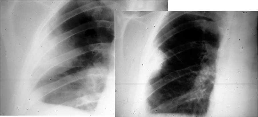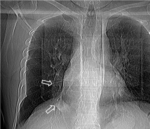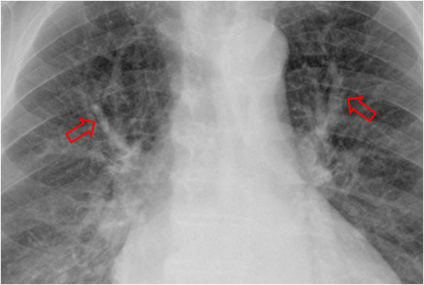 Signo de hipertensión venosa pulmonar en la radiografía posteroanterior de tórax. Consiste en el engrosamiento de las venas de los campos pulmonares superiores (flechas) por redistribución del flujo, normalmente dirigido hacia las bases de forma preferente. Si la presión venosa pulmonar no se controla con este mecanismo fisiopatológico, se produce el edema intersticial y, finalmente, el edema alveolar.