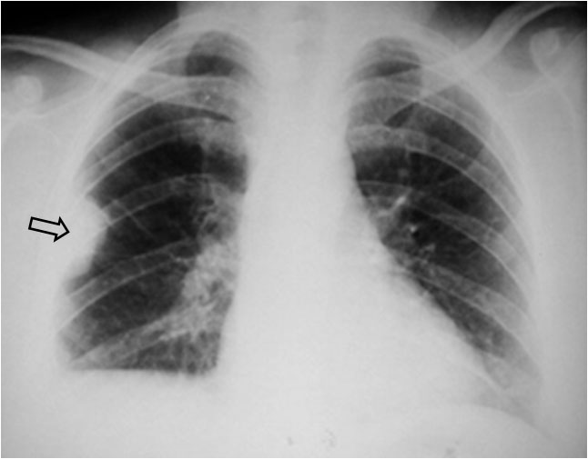Opacidad en cuña con base de contacto pleural, generalmente sin broncograma aéreo, que corresponde a infarto pulmonar. Aunque con frecuencia se localiza en el seno costofrénico lateral, puede encontrarse en otras localizaciones. La fotografía muestra una radiografía PA de tórax donde se observa una joroba de Hampton en el campo medio pulmonar derecho (flecha).