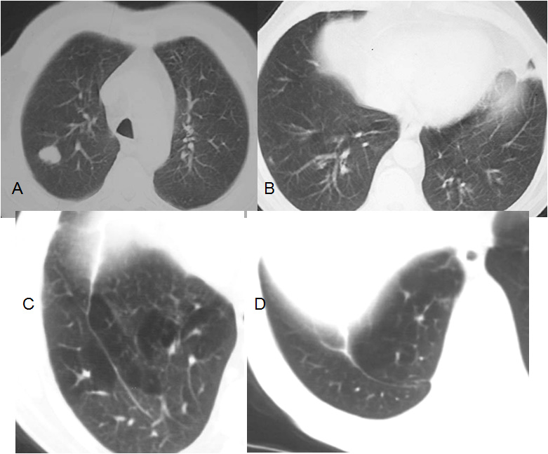 Paciente con nódulo en el lóbulo superior derecho (A). El estudio de TC en el momento del diagnóstico muestra una base pulmonar normal (B). Tras la lobectomía aparece una hiperinfuflación de la base pulmonar (C) alrededor de la cisura accesoria inferior, que es la imagen lineal que atraviesa la base pulmonar de adelante atrás. La última imagen (D) muestra la parte más inferior de la cisura accesoria, con un trayecto en arco que acaba en la pleura.