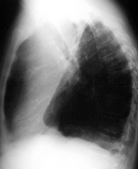 La proyección lateral confirma el colapso del lóbulo superior izquierdo, manifestado por el aumento de densidad anterosuperior, el desplazamiento anterior de la cisura mayor y la hiperinsuflación del lóbulo inferior.