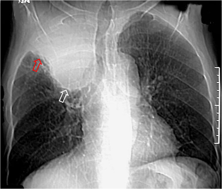 Signo de colapso del lóbulo medio derecho o del lóbulo inferior derecho que consiste en la presencia de una densidad triangular en la zona paramediastínica derecha (flecha roja) que corresponde a la zona de convergencia de las líneas pleuromediastínicas anteriores, desplazadas a la derecha por el colapso. El descenso de la posición de la cisura menor (flecha blanca) confirma la pérdida de volumen en el lóbulo medio, en este caso.