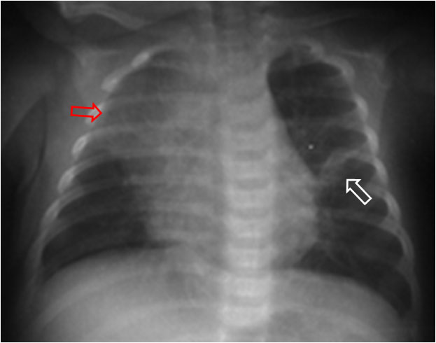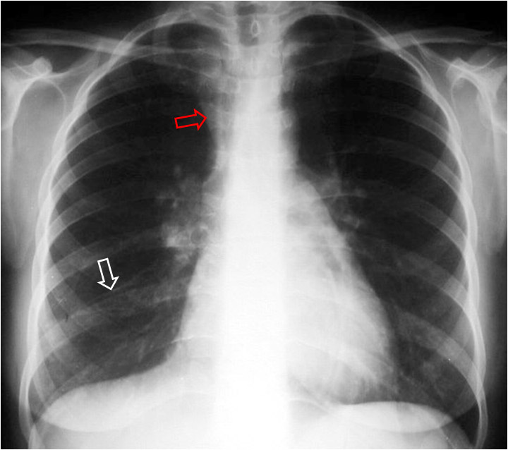 En la imagen vemos, además, un colapso del lóbulo superior derecho, de similar causa (flecha roja).