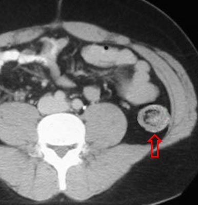 Corte axial de TC de abdomen de otro paciente que muestra una semiluna con la densidad grasa del mesenterio en una invaginación ileo-ileal.