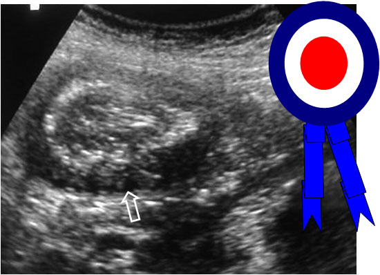 Signo de invaginación intestinal visible tanto en ecografía como en la TC abdominal, consistente en la imagen de bandas concéntricas de diferente ecogenicidad o densidad, correspondiente al asa invaginada en el interior de la invaginante, vista en un corte axial al asa. En ecografía, las bandas hiperecogénicas están formadas por la mucosa y la muscularis de la mucosa, y las hipoecogénicas corresponden a la submucosa.