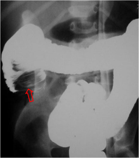 Signo de invaginación intestinal del lactante, visto en el enema opaco, que hace referencia al avance del contraste baritado entre el asa invaginante y el asa invaginada (flecha).