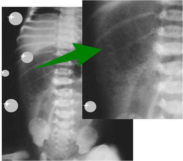 En el íleo meconial, en la radiografía simple de abdomen, la mezcla de meconio con el gas intestinal da un aspecto moteado como pompas o burbujas de jabón.