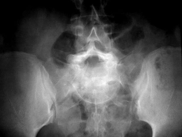 Signo de espondilolistesis L5-S1 en la radiografía anteroposterior de columna lumbar. El cuerpo vertebral de L5 desplazado y superpuesto al sacro da esta característica apariencia.