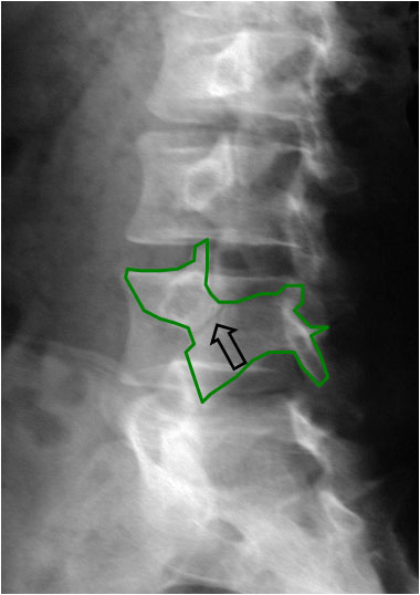 Signo de espondilolisis en la radiografía oblicua de columna lumbar. La imagen del perrito, un hallazgo clásico en radiología, está formada por: la apófisis transversa (la nariz), el pedículo (el ojo), la pars interarticularis (el cuello), la apófisis articular superior (la oreja) y la apófisis articular inferior (la pataa delantera).