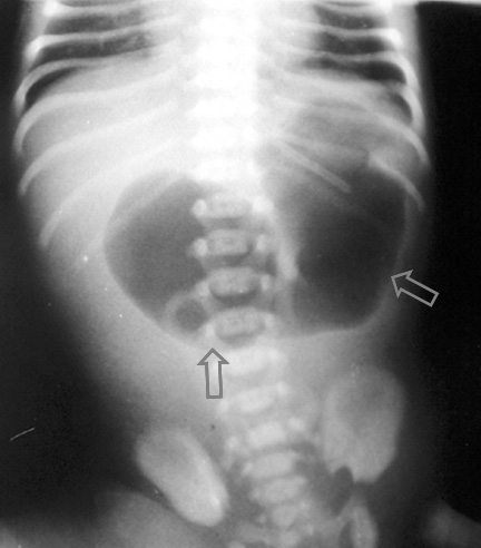En el recién nacido, la presencia de la cámara gástrica distendida (flechas) con escasa o nula presencia de gas en el resto de abdomen, indica la existencia de una obstrucción en el tracto de salida gástrico, como atresia gástrica.