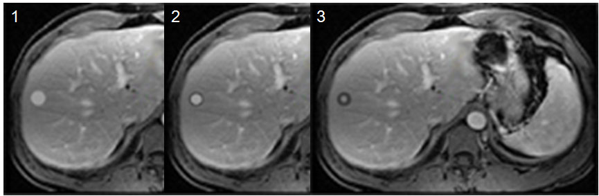 Las imágenes corresponden a una simulación de lesión metastásica hepática en una secuencia de imágenes de RM tras la administración de contraste (gadolinio). Imágenes potenciadas en T1. Imagen 1: imagen obtenida precozmente en el que la lesión capta contraste de manera uniforme. Imagen 2: en una fase más tardía la periferia de la lesión va disminuyendo su brillo debido al lavado del contraste. Imagen 3: corte tardío en el que sólo una pequeña zona central de la lesión mantiene el realce por el contraste.