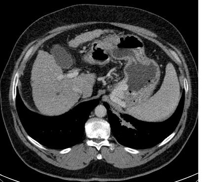 Signo de absceso hepático piógeno en la TC con contraste. En fase precoz se observa un área central hipodensa (el absceso) rodeada de un anillo denso (la pared realzada) –flecha verde- y una zona externa de baja densidad (edema) –flecha amarilla-.