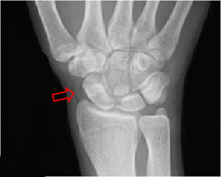 ESCAFOIDES2La flecha marca la banda adiposa del escafoides en una radiografía normal.