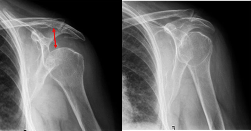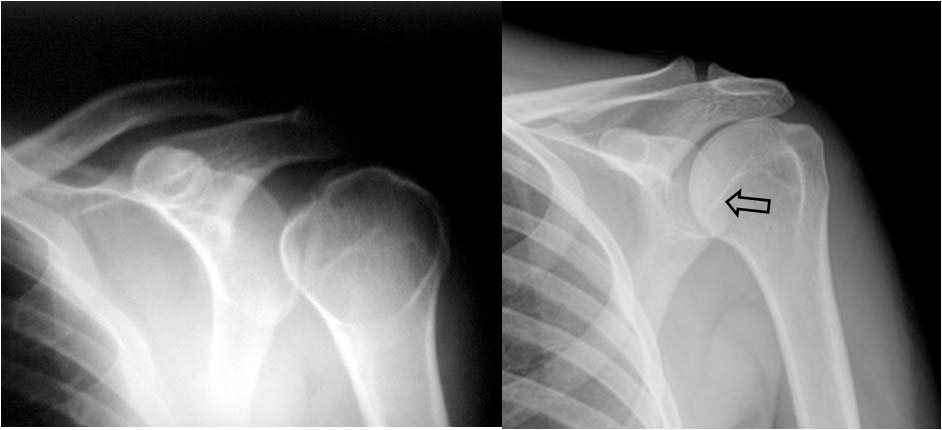La imagen muestra el signo en una luxación humeral (a la izquierda -flecha-) y una radiografía normal del hombro en la que se ve la posición de la cabeza humeral y su relación con la superficie articular eacapular y con la clavícula (a la derecha).