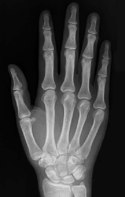 Imagen de una radiografía normal de la mano para comparar la altura de los metacarpianos.
