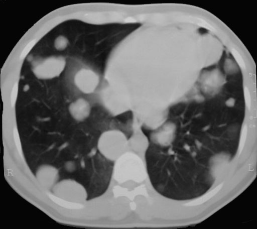 El caso que mostramos corresponde a un paciente con metástasis de seminoma. Abajo, la imagen de TC del mismo paciente.