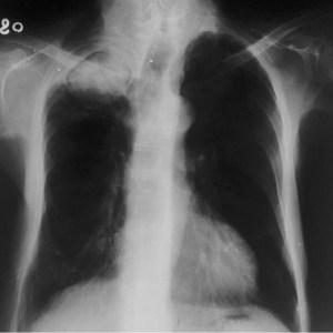 Un ejemplo del signo (flecha blanca) en otro paciente, también con carcinoma de pulmón (flecha roja). Existe un derrame pleural derecho asociado.