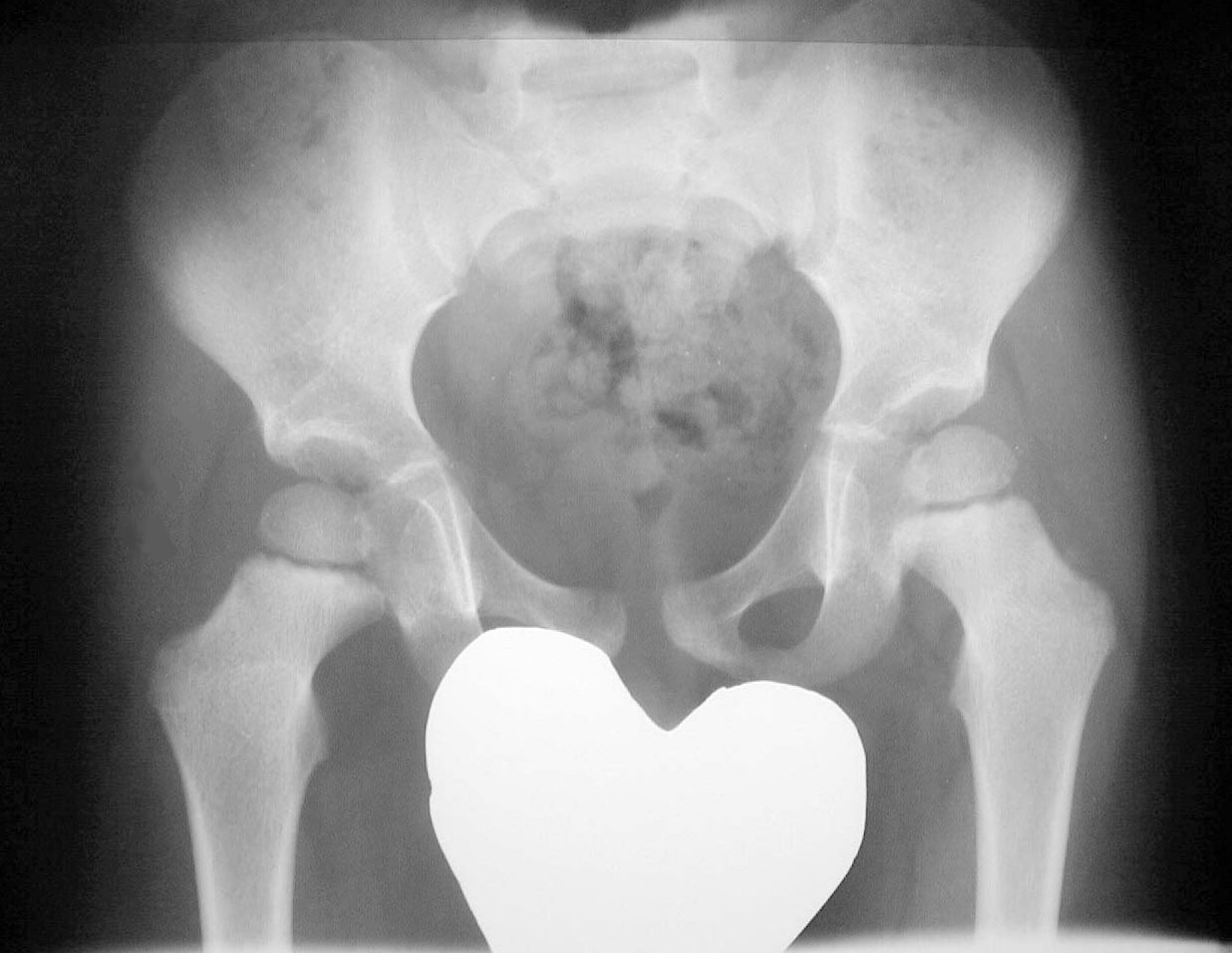 Signo de enfermedad de Legg-Calvé-Perthes (osteonecrosis de la cabeza femoral) evolucionada. Consiste en la existencia de una línea curva radiodensa en la base del cuello femoral (flecha) que, probablemente, representa el borde anterior o lateral de una cabeza femoral severamente deformada.