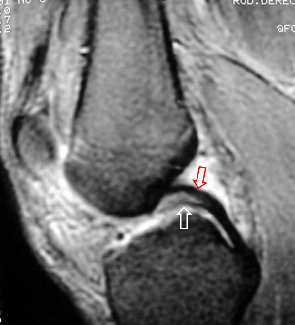 Signo de rotura meniscal en los cortes sagitales de Resonancia magnética. El fragmento roto (flecha blanca) se desplaza medialmente y se coloca bajo el ligamento cruzado posterior (flecha roja), dando la imagen de duplicación de éste.