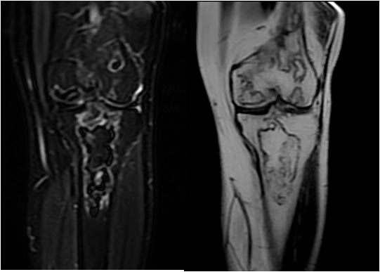 Otro ejemplo en un paciente con infartos óseos múltiples en fémur distal y tibia proximal.