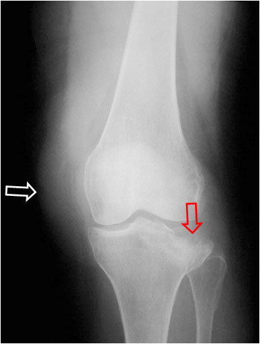 La radiografía anteroposterior de rodilla muestra la fractura del platillo externo de la meseta tibial (flecha roja) y el marcado aumento de partes blandas por el derrame articular (flecha blanca).