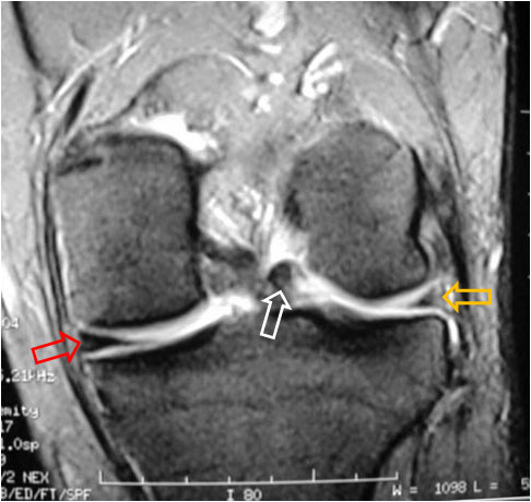 Corte coronal del mismo paciente en el que se observa la asimetría de los meniscos por rotura del externo (flecha amarilla) y la posición anómala del fragmento medial (flecha blanca). La flecha roja señala el menisco normal.