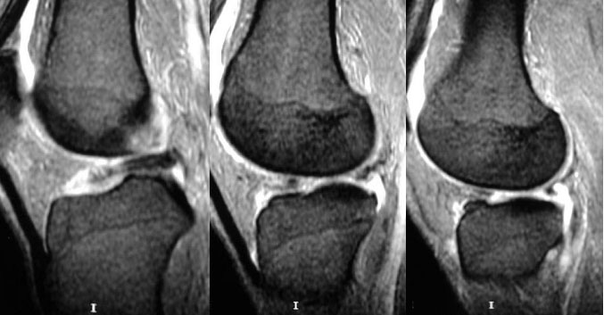 En los cortes sagitales de resonancia magnética de la rodilla, el cuerpo del menisco normal se parece a una pajarita (o corbata de lazo), es decir, se ven dos triángulos que apuntan uno al otro y se unen en el centro. Con cortes de 5 mm, debe verse en dos cortes consecutivos.