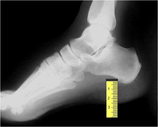 El engrosamiento de los tejidos blandos del talón mayor de 23 mm es un signo de acromegalia, aunque no es específico, ya que también puede verse por obesidad, edema periférico, mixedema , traumatismo o infección del talón. La radiografía corresponde a un paciente con acromegalia.