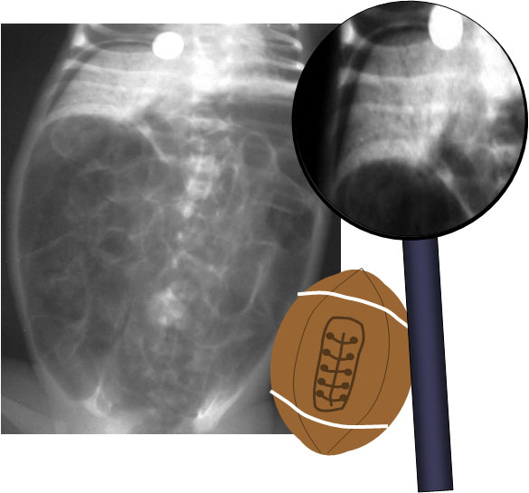 Signo de neumoperitoneo masivo visible en la radiografía simple de abdomen. La forma que adopta el aire en la cavidad peritoneal recuerda la morfología de un balón de rugby. Este signo es más fácilmente visible en niños. Este caso corresponde a un neumoperitoneo masivo secundario a enterocolitis necrotizante en un neonato. En la zona ampliada podemos ver aerobilia.