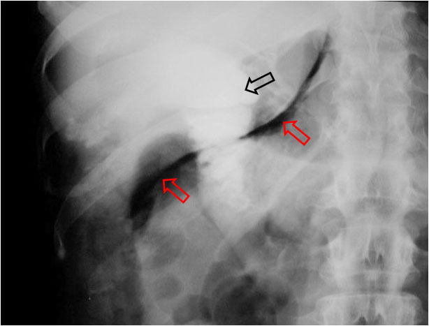 La imagen corresponde a una perforación duodenal en el transcurso de una CPRE con papilotomía, de ahí la presencia de contraste en la vía biliar y en el duodeno (flecha negra).