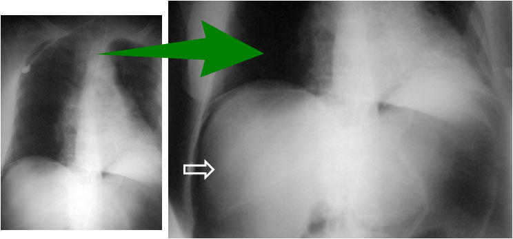 A la izquierda, radiografía posteroanterior de tórax en bipedestación, que muestra un extenso neumoperitoneo bajo ambas cúpulas diafragmáticas. La imagen de la derecha es la ampliación del área subdiafragmática derecha. En ella se perfilan las inserciones diafragmáticas (flechas).