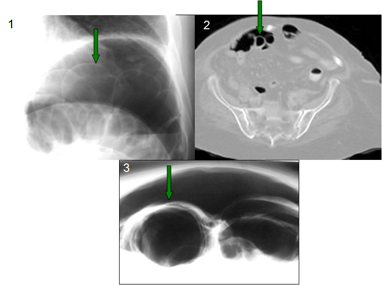 Este signo puede verse también en la radiografía de tórax (1), en la TC (2), y en la placa de abdomen en decúbito supino con rayo horizontal (3) aunque, en general, se requieren cantidades mayores de neumoperitoneo para su demostración.